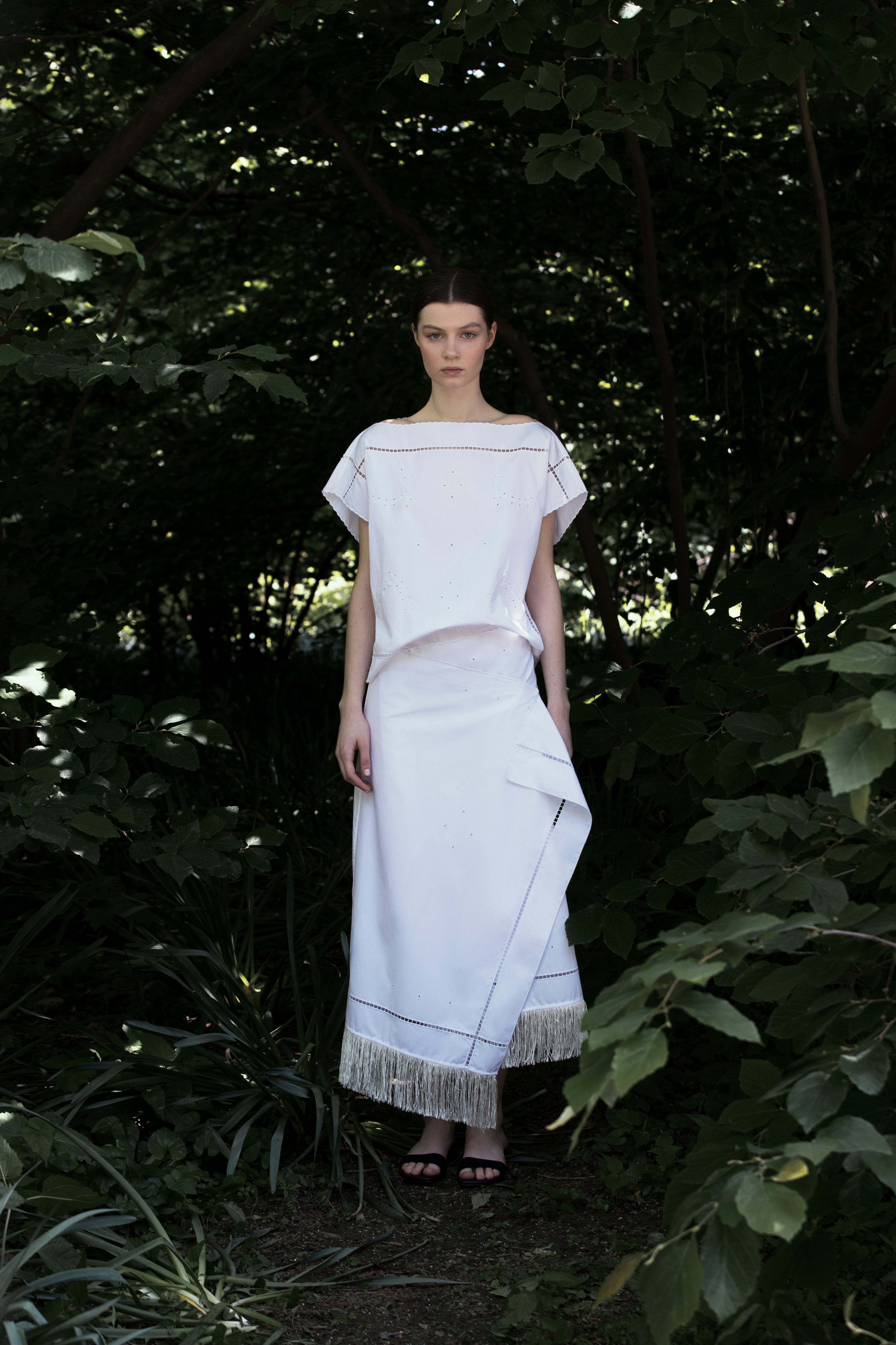 Loose fit top with minimalist ornate eyelet motif, featuring a boatneck and delicate scalloped edges.
