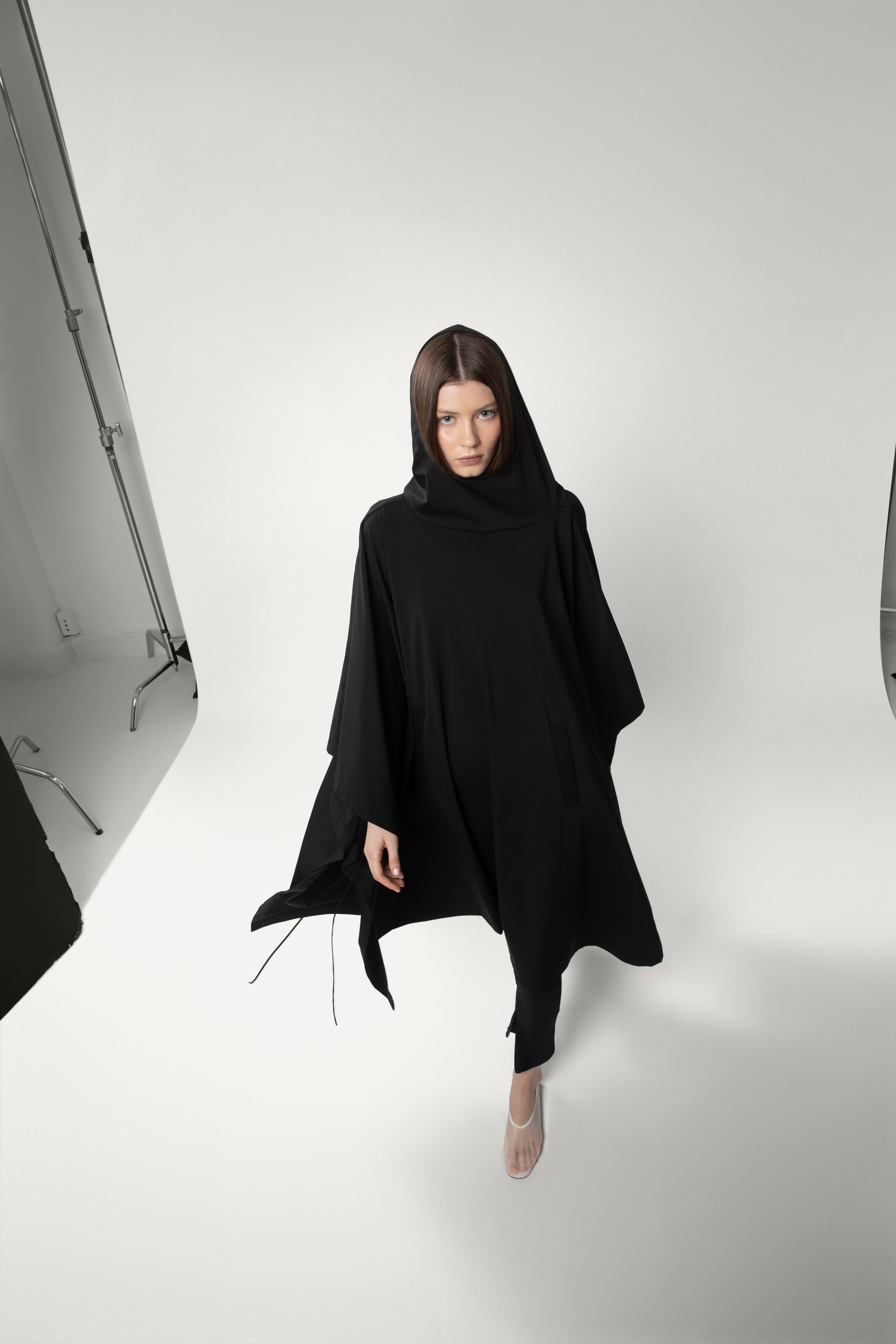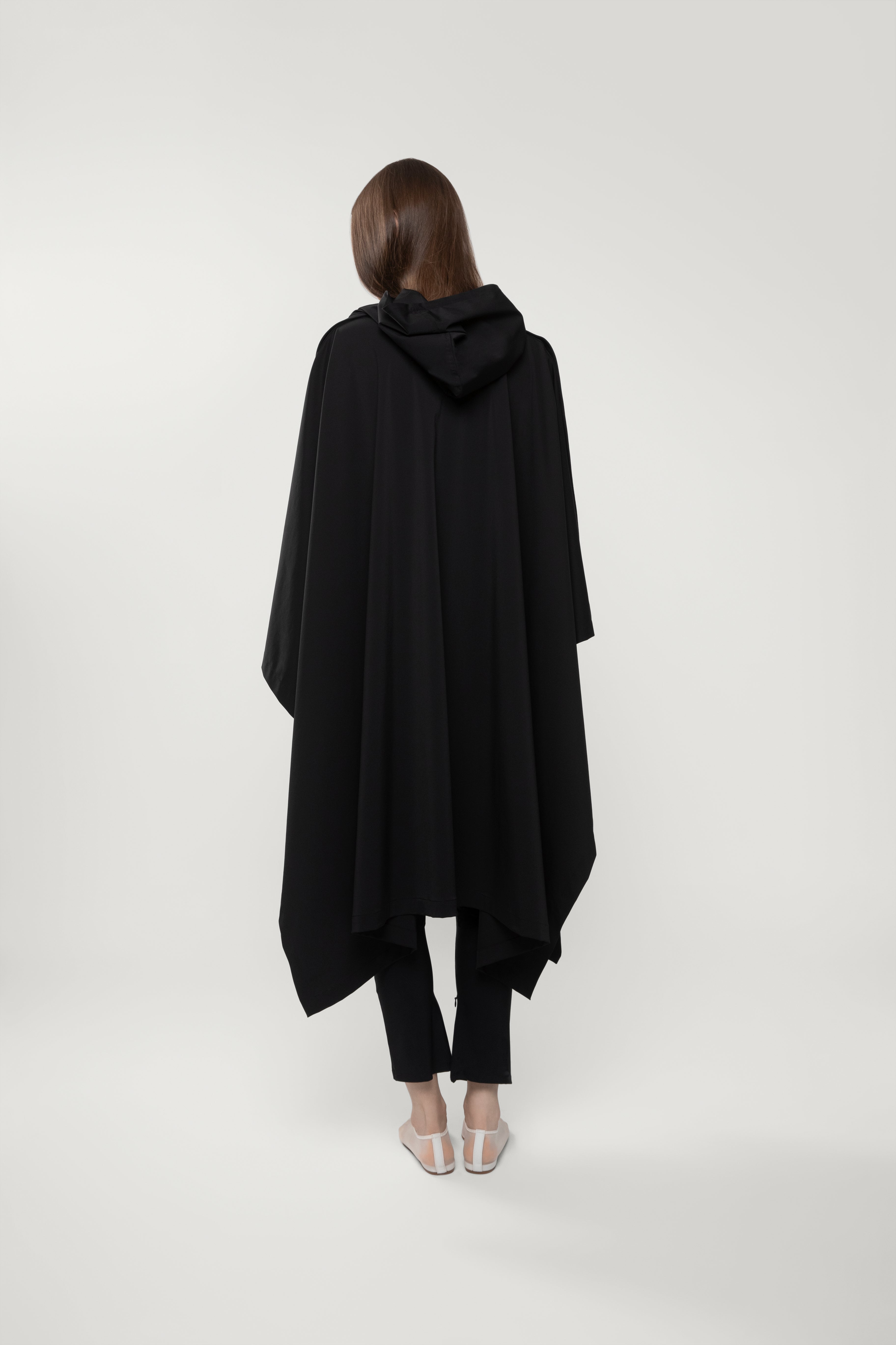 Mid-weight nylon poncho with adjustable shoulder snap closure, hood, pockets, and leather ties.