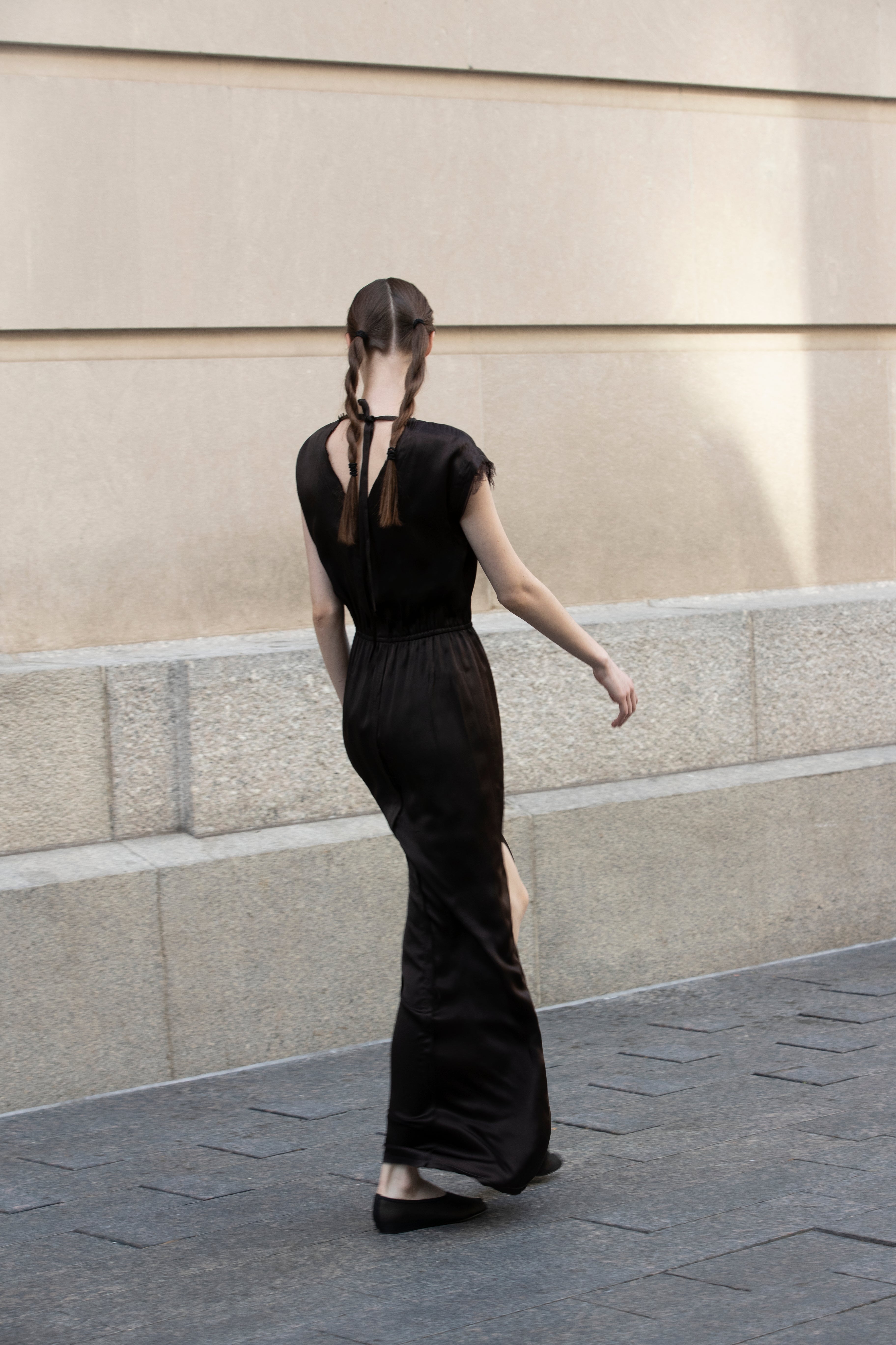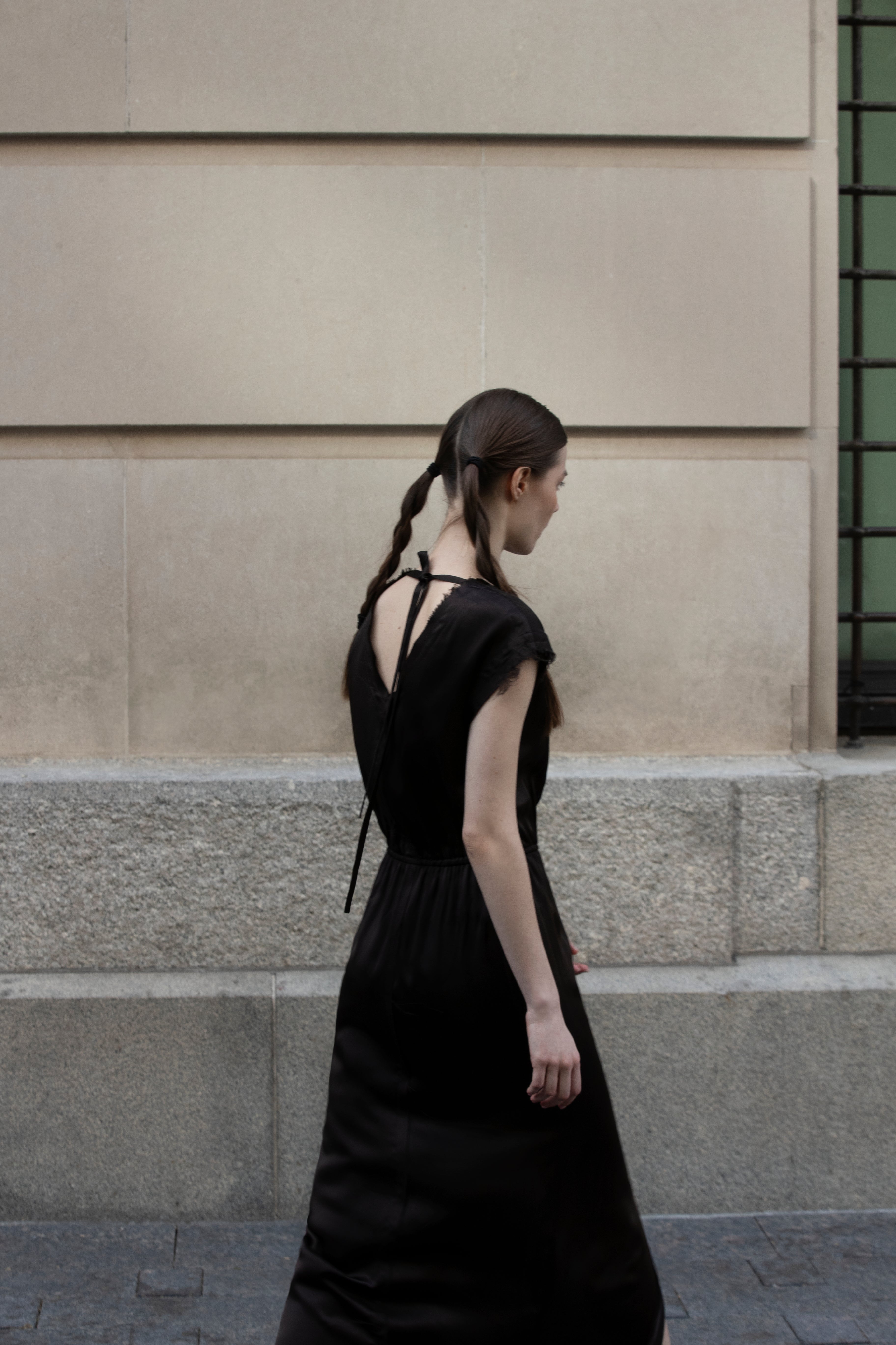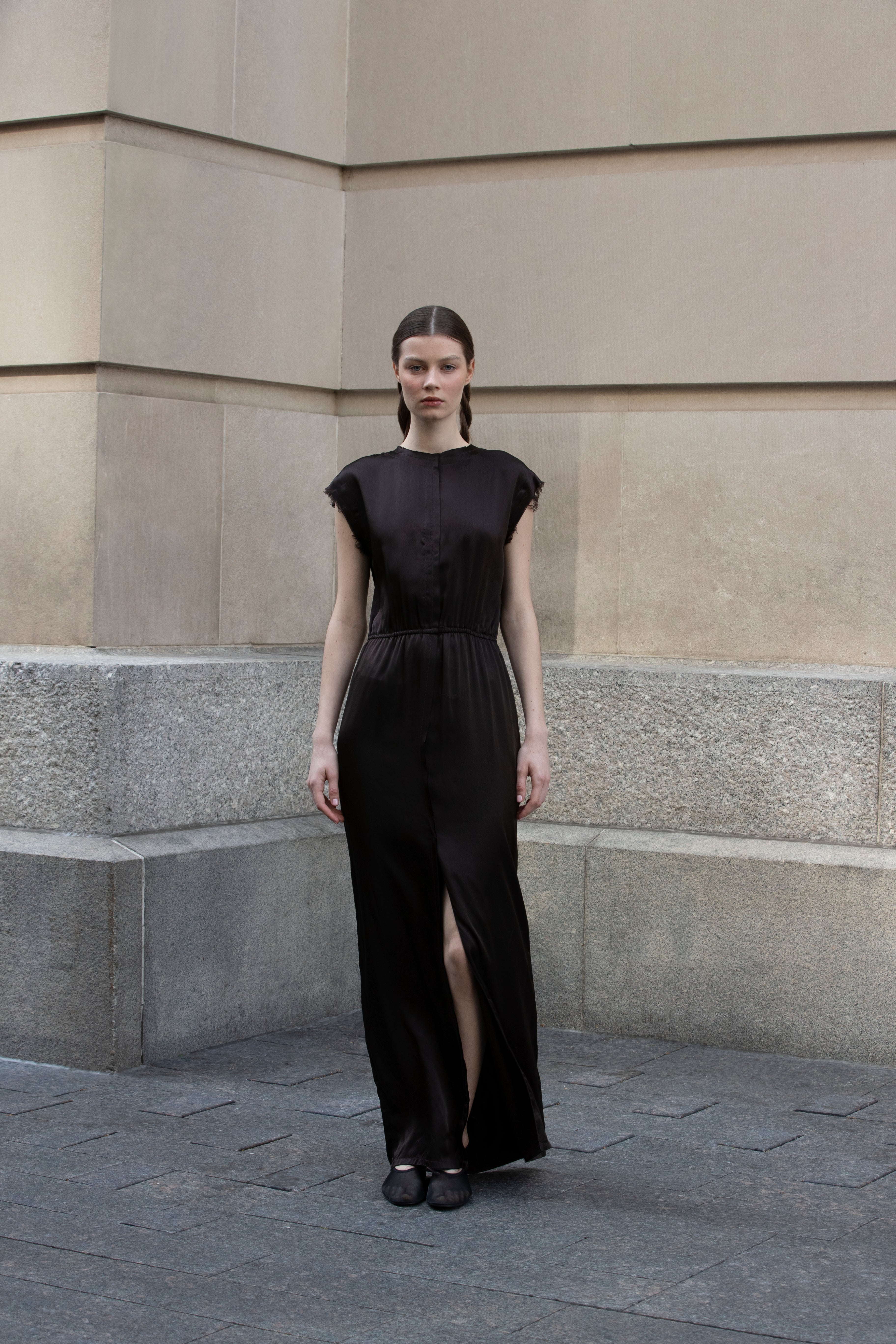 Fluid silk charmeuse dress with delicate frayed edges and a front slit.